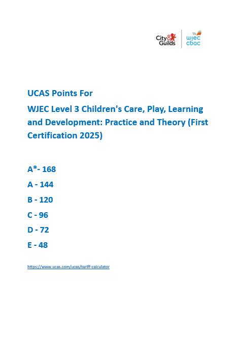 Completion of the Level 3 Children's Care, Play, Learning and Development: Practice and Theory qualification provides a suitable foundation for the study of early years and childcare through a range of higher education courses, or apprenticeships.